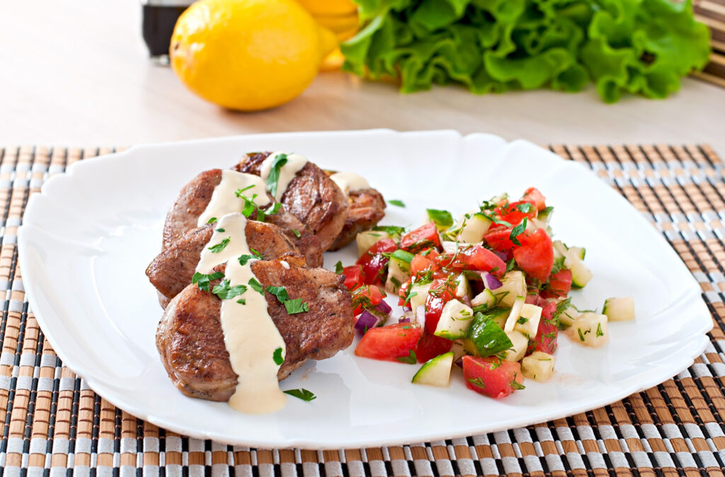 Mit Dip nach Wahl anrichten. Ideal, wenn schnell eine ausgewogene Mahlzeit auf den Tisch soll.